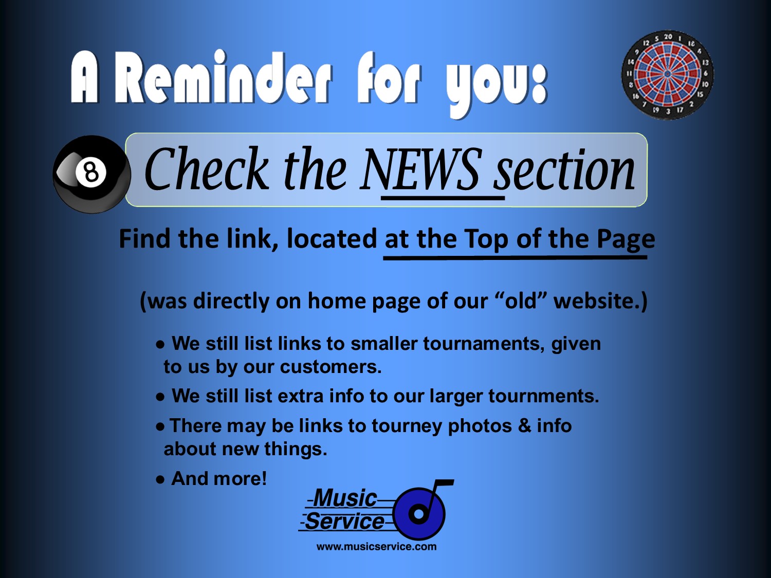 Take advantage of the knowledge and expertise available to Music Service customers. Reacquaint yourself with honesty and sincerity when dealing with your amusement provider. Become a member of the Music Service team.